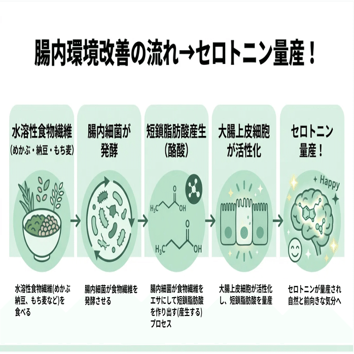 水溶性食物繊維(めかぶ・納豆・もち麦)→短鎖脂肪酸→セロトニン量産が改善の王道